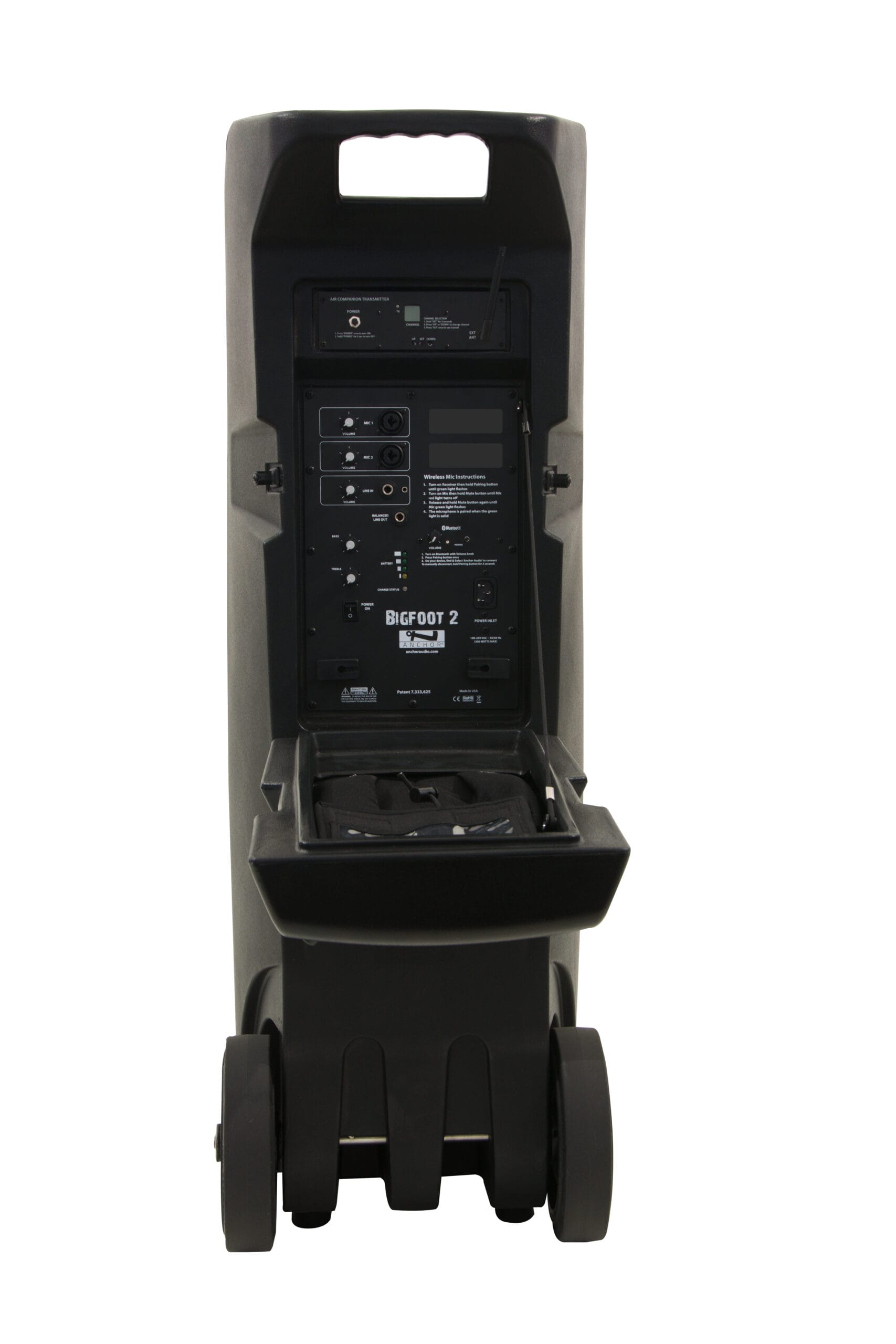 The Anchor Audio Bigfoot 2 with Built-In Bluetooth & AIR Wireless Transmitter, Battery Powered Portable PA System features built-in rechargeable batteries that operate 6-8 hours on a single charge along with heavy duty wheels for easy transport. This system is Anchor AIR wireless companion speaker compatible and can also connect up to 4 wireless mics. An onboard mic storage bag is also included with the system and it is designed to cover a football field or large auditorium while reaching crowds of 5,000+.