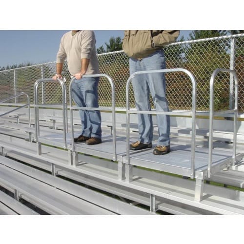 This bleacher podium is 36 x 36 inches in diameter with three detchable 33 inch boundary rails. Legs are also adjustable to fit the bleacher height and width. Multiple podiums can be attached to create a larger performing area. Easy assembly requires no tools and can be used for indoor and outdoor performances.