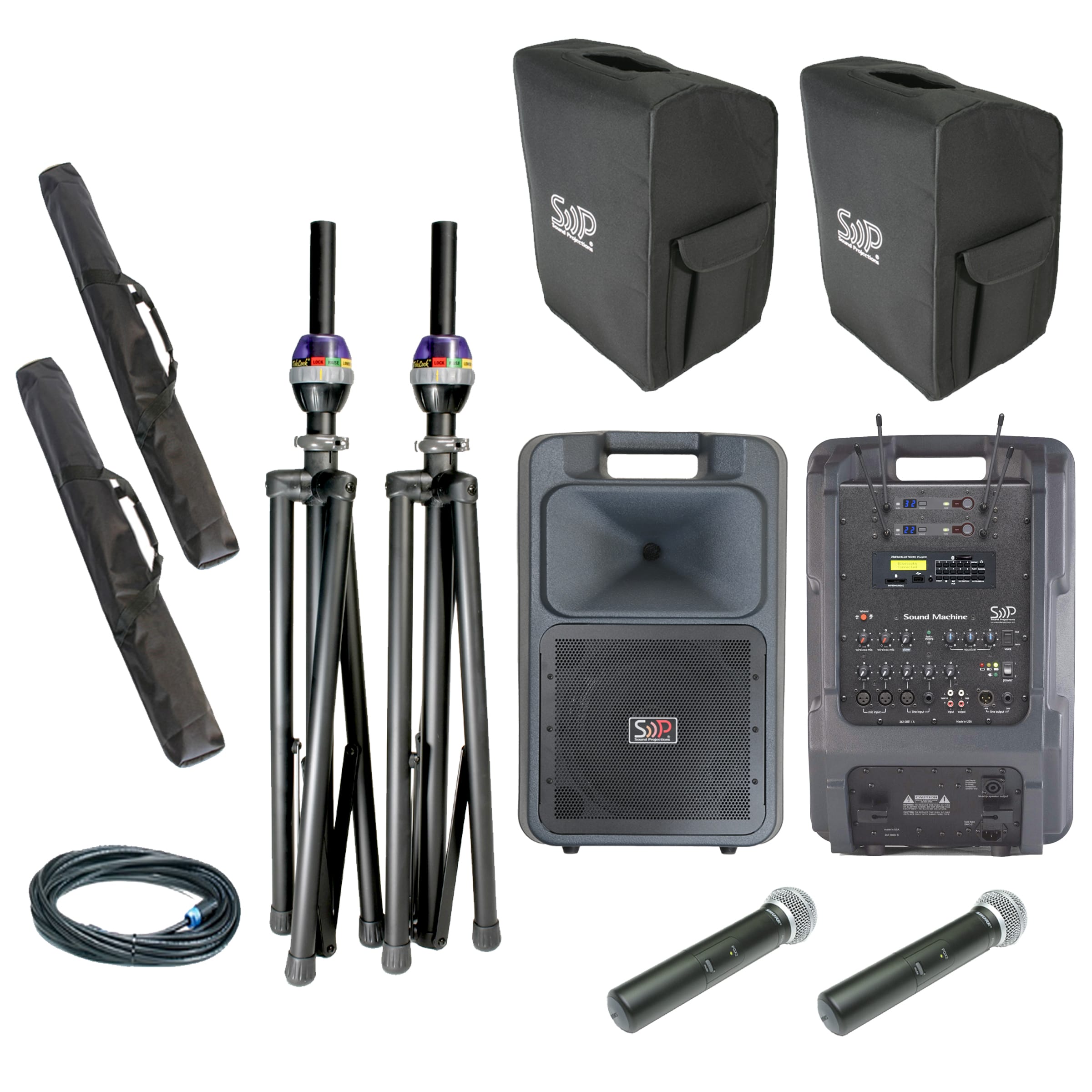 This Sound Projection Deluxe SM-5 with Bluetooth USB/MP3 player, 2 Digital wireless handheld systems is a very popular and versatile sound system.