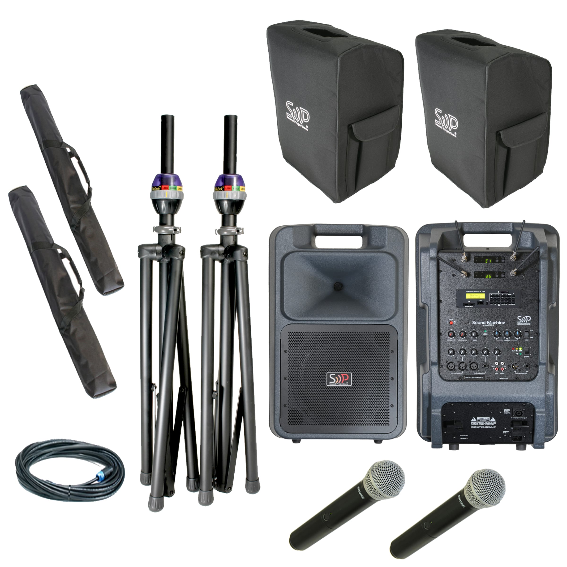 This Sound Projection Deluxe SM-5 with Bluetooth USB/MP3 player and 2 UHF wireless handheld systems is a very popular and versatile sound system.